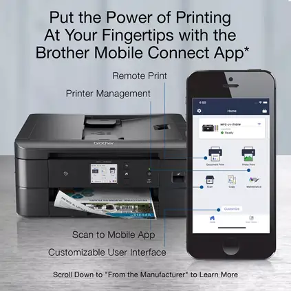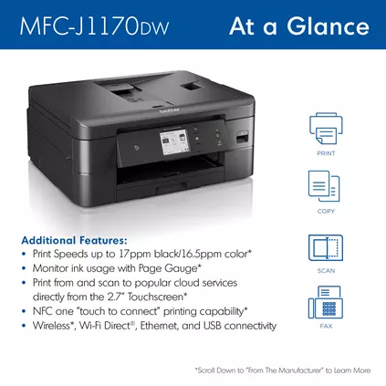 The MFC-J1170DW is easy to connect and operate along with being compact and economical making it ideal for your home office or small office needs. Featuring fast inkjet print â up to 17 ppm black and 16.5 ppm color(6). Its robust features, high quality output, duplex printing and business-centric functionality are not all normally found in similarly priced inkjet printers. Offering multiple connection options including a built-in wireless(3) interface for sharing with multiple network users, Wi-Fi Direct(R), Ethernet or connect via a USB interface. Thereâs no network setup needed for NFC one âtouch to print and scanâ mobile device printing(4). A 2.7 inch color touchscreen enables easy navigation to access powerful features plus print-from and scan-to popular cloud services directly from the printer(5). Also featuring the Brother Mobile Connect(1) App, that gives you the freedom to print and manage your printer from virtually anywhere. The MFC-J1170DW also features the unique Brother Page Gauge(2) which estimates remaining page levels, so you always know how much ink you have left. Use the 20- page capacity automatic document feeder or the 150-sheet capacity adjustable paper tray for generous output without constant monitoring. Includes a 2-year limited warranty and free online, live chat or phone support for the life of the printer. Works with Alexa.